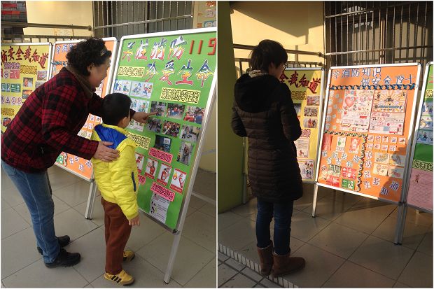 宣传栏前常常能听到一声声稚气的声音“这副图是告诉人们不要玩火”、“这是告诉人们发生火灾时不要坐电梯”、“这是告诉人们发生火灾时可用湿毛巾捂住鼻子和嘴巴,赶快想办法离开……”孩子们争先恐后地回答着、议论着。放学时间到了,宣传栏前的交流声更是此起彼伏,“妈妈,这幅图是告诉大家手机充完电,要及时把插头拔下来,你以后要记住哦!”;“爸爸,你会使用灭火器吗?我告诉你,要把灭火器瓶上的插销先拔起来才可以用”;“爷爷,这幅图是告诉人们不能乱扔烟头,乱扔烟头容易引起火灾”;“奶奶,你以后煮完饭要记得关火哦”……瞧,孩子们简直成了消防宣传员了!