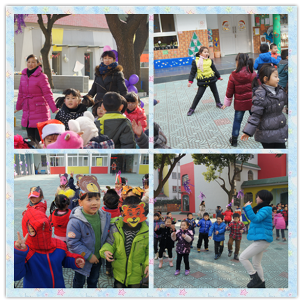 上午10:10,当幼儿园想起“幸福拍手歌”,孩子们盛装出席我们的元旦舞会,有的戴羽毛面具,有的打扮成蜘蛛侠,还有的挥舞着手中的仙女棒……操场上顿时热闹开了,小朋友、老师、婆婆们舞成了一片。