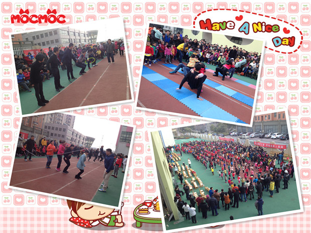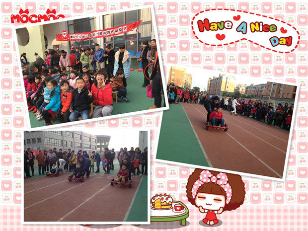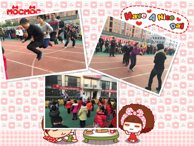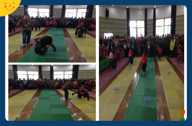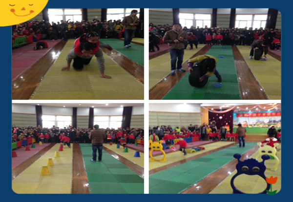 紧接着,一个一个好玩的游戏轮番上阵,加油声、呐喊声、欢呼声沸腾了整个幼儿园。《运粮》游戏中爸爸妈妈滚着轮胎和孩子一起“收粮”前行;《跳荷叶》游戏爸爸妈妈手拿垫子,默契的协助孩子跨过小河;《小牛向前冲》游戏中爸爸妈妈背起孩子奋力向前爬行,真有那股“冲劲”;《爸爸去哪儿》游戏,爸爸推着孩子稳稳向前,去感受父子间的独特情感;《传递呼啦圈》游戏爸爸妈妈手拉手,将呼啦圈一个一个传递下去;《跳长绳》游戏更是考验了家长的默契配合……趣味十足的亲子游戏,幽默诙谐的动作让人忍俊不禁,家长朋友们在老师精心设计的亲子游戏中玩得不亦乐。大家全神贯注的神态以及获胜后的喜悦,构成了一片欢乐的景象,冲淡了冬季带来的寒意。