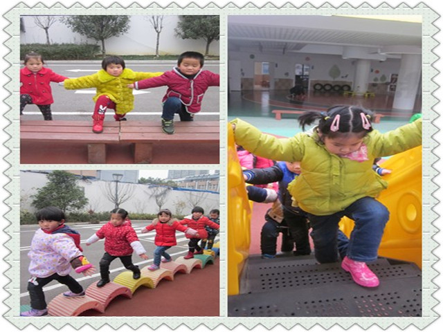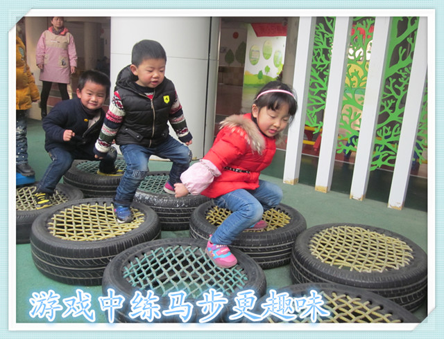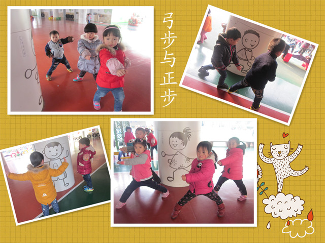 本次老师们花了更多心思,从校园活动环境入手。以“吸引幼儿眼球、培养幼儿兴趣,促进幼儿健康,带给幼儿快乐”为主旨,让孩子能在会说话的环境中潜移默化地学习、训练。看,老师们在孩子们每天玩耍的风雨操场柱子上贴了自创的可爱武术小人,供孩子们学习基本动作,并通过双排轮胎蹦床、拍皮球达到马步练习的目的;通过玩滑梯、走独木桥、学小飞机起飞等游戏,达到弓步练习的目的。