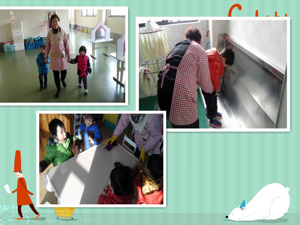 入 厕:照顾年龄小的幼儿入厕,帮助穿脱衣裤,培养幼儿良好的入厕习惯。将手纸裁好放在固定位置上。