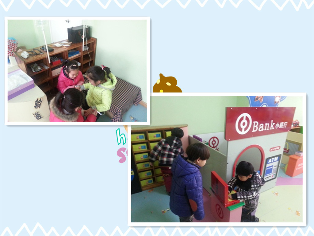 “小社区”的主角全是小朋友,孩子们承担着不同的社会角色,体验着不同的社会活动。瞧!“麦当劳”的营业员们吆喝着自家的“美味”,顾客也在兴致勃勃的购买着美食;在“儿童医院”小医生们给小病友们看病、打针;“贝贝银行”的个人理财中心里,孩子们旋转趣味密码,开启密码宝盒,将自己的宝贝存放于此;“乐乐超市”里宝贝们正在选购着自己需要的物品……此时孩子们已经和游戏融为了一体,到处洋溢着他们自信的笑容。