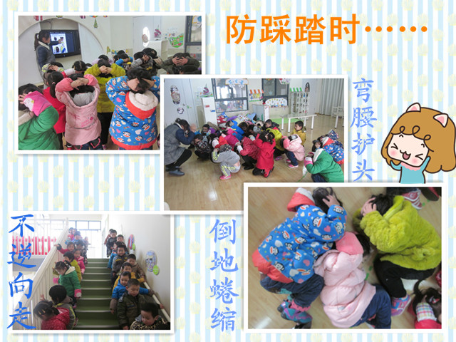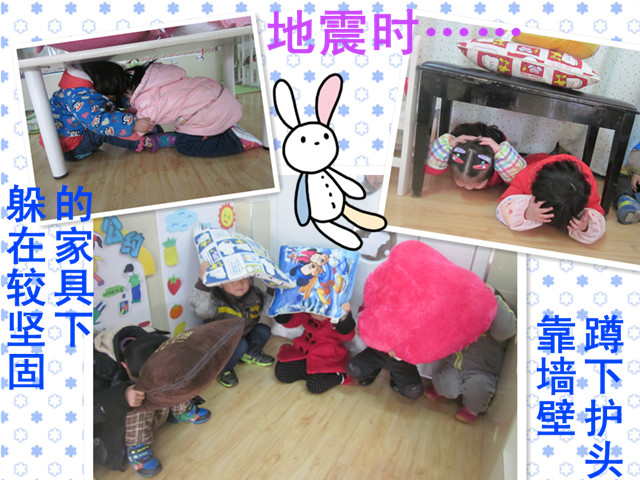 活动分三天进行,老师分别通过照片、视频、亲身示范等直观地让幼儿学会观察可能正在发生的安全事故现象,判断应该用何种正确的方法逃生和自保。如:当火灾发生时,要手拿毛巾捂住口鼻,跟随老师有序地弯 腰撤离;发生地震时如能及时撤离最好,如果来不及撤离就找到相对坚硬的家具躲在下面,或用柔软的东西护头,抱蹲于墙角;为避免发生踩踏,在人多的地方应顺人流走,避免逆向行进,而一旦发生踩踏时,立即靠墙蹲下,或双手抱住后脑勺,蜷缩身体应势倒地。