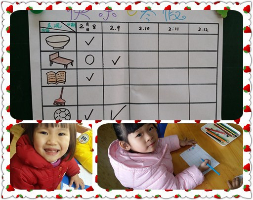 课堂上,老师们和幼儿一起动手制订一张《寒假生活计划表》,表格由时间、具体内容和完成情况三个部分组成。内容可以用图画的形式来表示,可以是:按时起床、认真学习、加强锻炼、良好进餐等一日生活的各个环节。打勾部分根据宝宝的表现,由家长和宝宝一起来决定,完成的好的可以打一个勾,完成很棒的可以打两个勾,没有完成的则不能打勾。