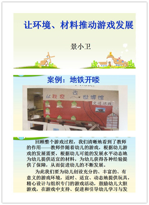 景老师分别从“ 创设满足兴趣、激发挑战的游戏环境” “让玩具成为幼儿不可或缺的伙伴” “动态调整环境材料,适时推进幼儿游戏发展”三个关键点来进行详细的剖析与提升。在景老师的带领下学习,让教师们对游戏有了全新的认识,同时看到了教师在游戏中的重要作用,教师伴随着幼儿游戏,教师只有根据幼儿游戏的发展需要及幼儿的发展水平提供相适宜的材料,才能促进幼儿的不断发展。