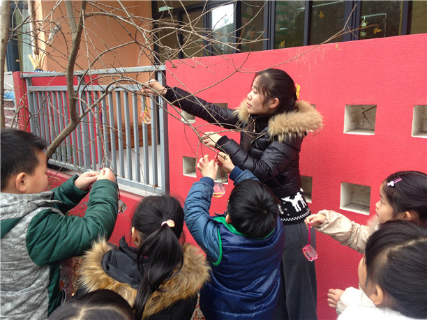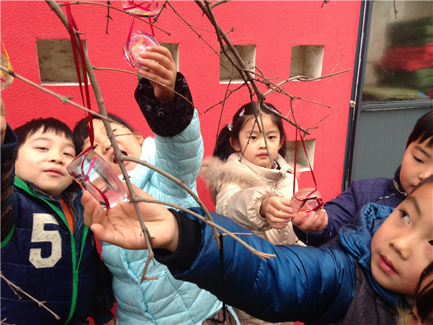 为了让幼儿了解北方冬季的冰灯,激发幼儿制作冰灯的兴趣。本周,我园大班年级组织小朋友们开展一起制作冰灯活动。在老师的指导下,孩子们自选各式容器放上清水,再用小饰物精心装点后放到户外,等待一夜,美丽的冰灯就做成了。瞧今天一大早孩子们已迫不及待了,红红的脸蛋满载欢喜,拿冰灯、挂冰灯、赏冰灯兴致勃勃。此时悬挂枝头上的冰灯,经阳光照射,更加晶莹剔透。