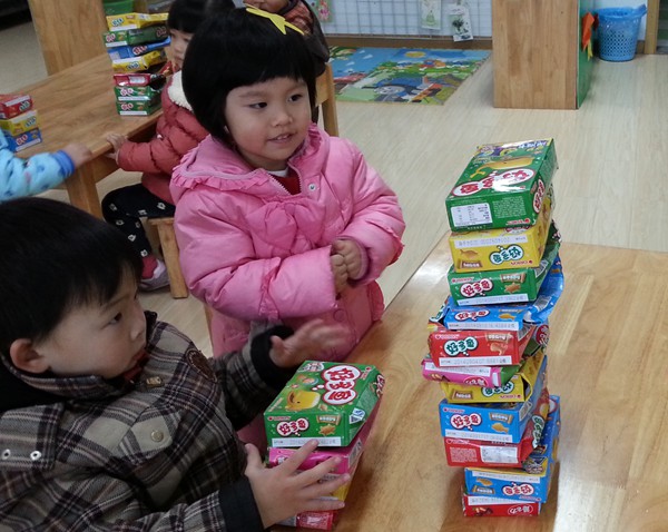 活动中,教师们提供大量的纸盒,鼓励幼儿亲自尝试,发现多种玩盒的方法。幼儿们在愉悦的情绪下大胆参与,积极动脑,主动参与探索纸盒的多种玩法。有的幼儿用纸盒做角色游戏:做成小桌子“开餐馆”、“过家家”;有的幼儿用纸扮演“小乌龟”开展体育游戏;还有的幼儿把纸盒叠加起来玩堆堆乐……他们能充分运用纸盒,创新多种玩法,做到一物多用、妙用和一用到底。