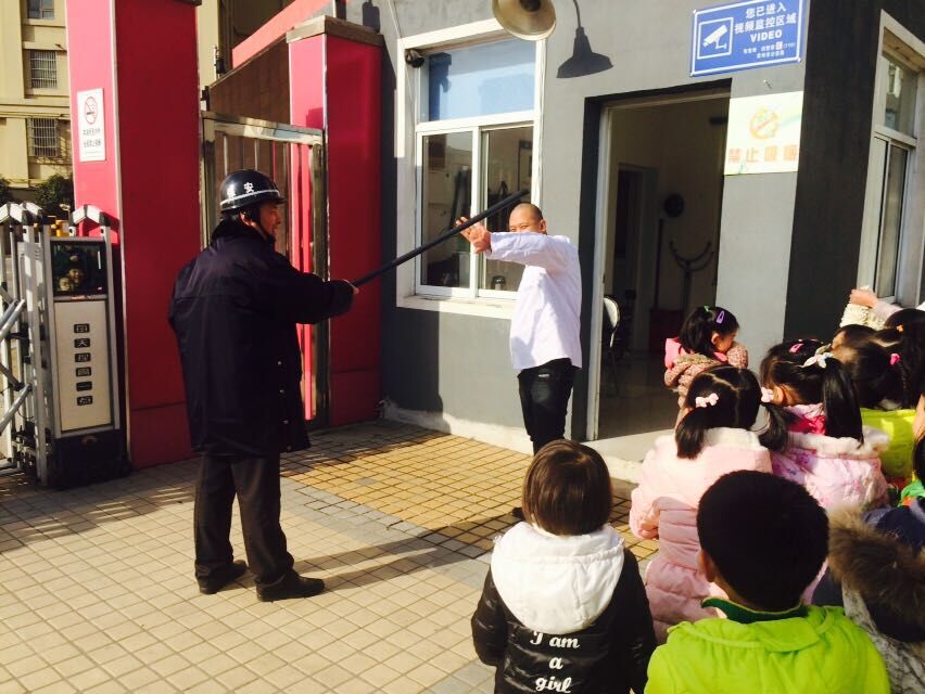 保安爷爷先为孩子们讲了如果遇到坏人不要慌张,应该用巧妙的办法逃跑,如果跑不了也应想办法牵制坏人,避免自己受伤害。爷爷还现场为孩子们演练了如何使用钢叉、警棍等防身器械,孩子们也听得看的很认真。爷爷还现场指导孩子们如何使用警棍,如果发生危险的地方没有警棍,也可以随手用身旁的其它物体来自我防卫,来保护自己。
