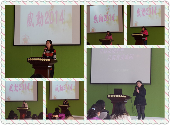 此次活动由三个部分组成,分别是“感动2014”、“感激2014”、“感恩2014”。顾园长首先发表了“新年寄语”,感谢在过去的一年里为我园幼教事业默默奉献的所有教职工,接着七位代表老师结合自己的教学工作和班级管理经验,讲述各自工作中发生的酸甜苦辣的事,跟大家分享了自己在教育教学工作、家长工作中的体会与心得。激情洋溢的演说和生动的德育事例,把活动气氛一次次推向高潮。之后幼儿园举行了隆重的颁奖仪式,园领导班子成员为本学期在各方面表现出色的老师进行表彰、颁发奖状。这些奖项不仅是对获奖教师的肯定,更是对全园教职员工的激励和鼓舞。