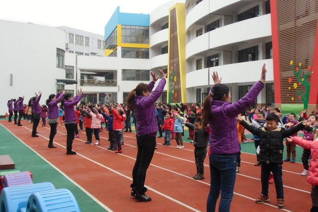 此次的早操编排是根据3-6岁儿童身心发展特点,在音乐的节奏旋律上,动作的编排上,都融进了童趣与时尚的元素,提升了幼儿园原有早操的趣味性及艺术品味,当节奏感强的“进行曲”音乐响起来时,孩子们马上站好队,随着音乐快乐地做起了新操。老师和孩子们时而拉手拥抱,时而伸展手臂,时而扭腰拍手,笑容尽情地绽放在孩子们的脸上,幸福荡漾在孩子们的心间,新操——给孩子们带来无穷的乐趣。