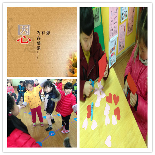 日前,彩虹幼儿园中三班开展了“感恩你我 真情成长”为主题的活动。活动中,大家一起聆听感恩的故事,一起精心制作爱心卡,孩子们还在老师的带领下一起学唱歌曲《感恩的心》……。“我要感谢爸爸妈妈养育了我,感谢老师教我知识,感谢小朋友帮助了我,……我爱你们。”小朋友们诉说着心中感恩的话。在一个文明的社会,知道感谢,怀有一颗感恩之心是很必要的,我们还提倡把“感恩、知恩、报恩”活动分解、渗透到日常生活中,鼓励孩子为家长做一些力所能及的事情,如帮妈妈洗脚、打扫卫生等,让孩子们从小学会感恩,懂得知恩图报。