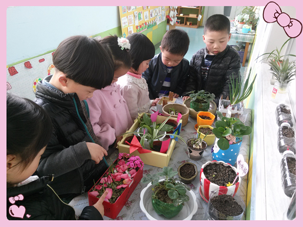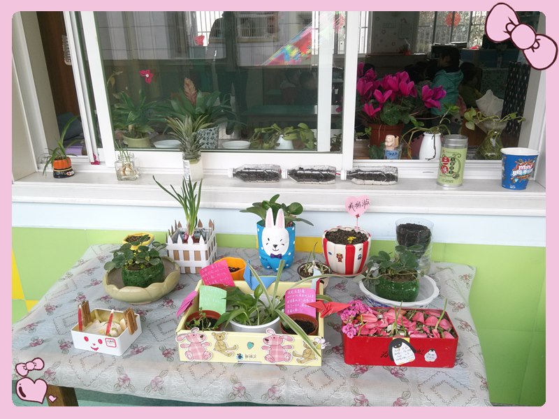 瞧!他们在DIY自制的容器里种下了希望的种子:有蕃茄、玉米、大蒜等农作物,也有菠斯菊、太阳花、紫罗兰等花卉,每一个植物小景都寄托着孩子们的美好希望,期盼着在自己的呵护下能有美好的收获。当大家把自己在家里做好的DIY植物小景带来幼儿园,所有的小朋友们都被这些美好的植物吸引了,他们一起欣赏、评论。后期将做跟踪记录,将这些植物的生长过程随时记录下来。