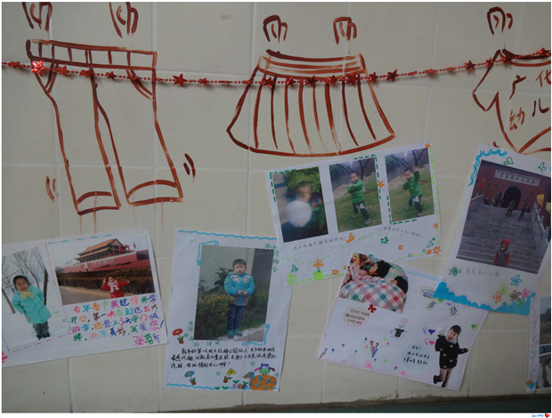 活动后期,经过老师们的整理、设计,海报被巧妙地布置在了班级外环境中,吸引了许多家长的脚步并投来赞许的目光,纷纷与孩子们一起欣赏旅游中的美丽回忆,静静地聆听孩子们述说其他宝贝们的出游经历。