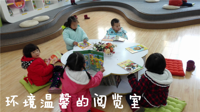 幼儿园设立了阅览室,整齐的书柜摆满了图书,幼儿取放自如,舒服的沙发、柔软的靠垫、可爱的毛绒玩具,让孩子在良好的环境中享受阅读的快乐。