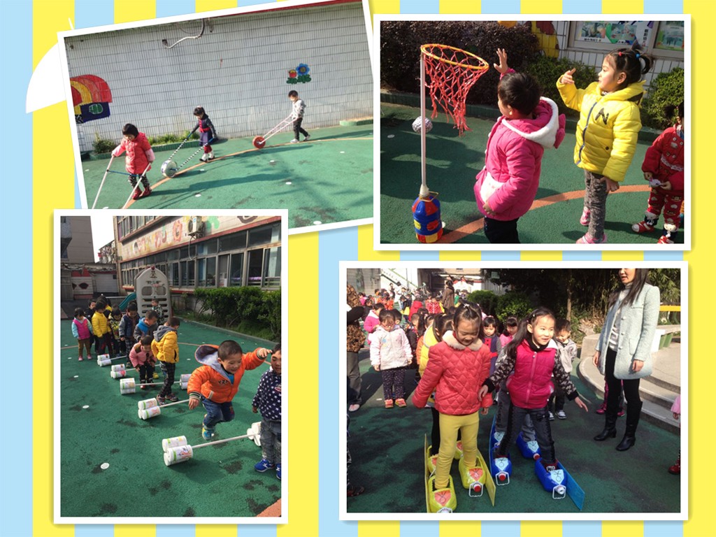 教师们根据本班幼儿的实际年龄和兴趣特点,除了提供园内购置的一些体育器械外,还和家长创造性地用废旧材料制作了一些可供幼儿进行各种动作练习的玩具,如奶粉桶制作的杠铃;饼干桶制作的小推车;雪碧瓶制作的大鞋;塑料绳制作的篮球架等。