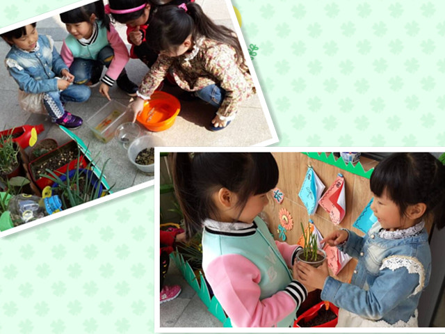 走近每个班的自然角,到处是一派生机勃勃的景象,生命之绿呼之欲出,真可谓“春色满园关不住”。最有趣的当然是大班挂在自然角边上的观察记录本了,打开漂亮的扉页,里面有每天的天气状况、浇水施肥情况记载,还有动植物的生长情况。孩子们运用数字或者简笔画来表述,稚嫩的字符富于童趣。