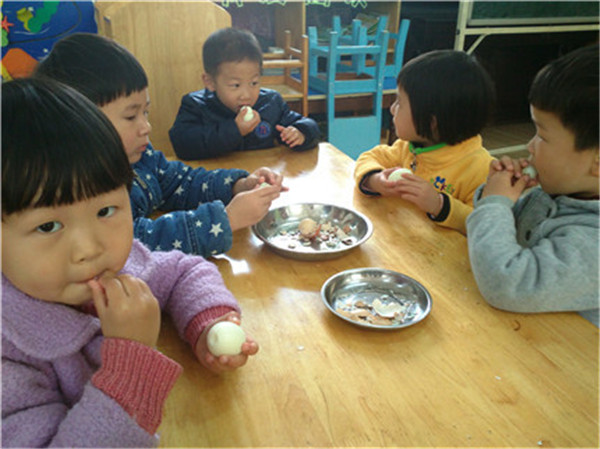 在活动中教师们采用不同的教学手段,创设多元的感知方式,使孩子沉浸在一种“探究”“想象”的氛围中。第一环节时引导幼儿通过触摸蛋宝宝、和同伴的观察比较中感知不同蛋宝宝的大小、颜色、花纹等,调动幼儿的多种感官,激发幼儿的幼儿探索的欲望。第二环节则是活动的一个高潮,尤其是当一位幼儿将蛋宝宝打开却没有看到蛋清时,孩子们都发出了惊叹,老师则抓住幼儿急于知道原因的心理,顺理成章的将视频导入,孩子们的注意力一下子就被视频的内容吸引住了。第三环节是对前三过热环节的补充,孩子们都知道蛋宝宝有营养,多吃蛋身体好,那么蛋宝宝可以变成哪些好吃的菜呢?一个小小的悬念,通过PPT的手段给孩子一些感性的认识。