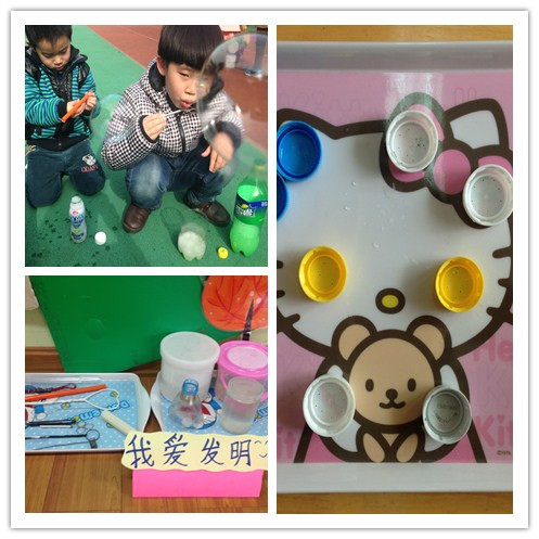 近日,彩虹幼儿园中班开展了一系列科学小实验活动。老师选择了一些取材方便,易于幼儿操作的小实验,鼓励幼儿进行尝试。如把鸡蛋壳当做小花盆,孩子们在里面种满了小植物,亲眼观察它们长出了长长的根须、新的小叶子,就像蛋壳长出了新头发;在好奇心的驱使下,孩子还在瓶盖上戳了不同的眼,装上瓶子之后水就从这些洞里射出,孩子们惊喜的发现,会产生不同的花式水柱,同时瓶子的大小也影响水柱的长短;还发现了清水杯里放足了盐,鸡蛋就会浮起来;还发现了绳子连接纸杯后能清楚的听到对方的讲话声;红颜色和黄颜色手拉手,会变成其他的颜色,孩子们用自己的方式进行了记录;泡泡水里加了醋还会吹出很大的泡泡……