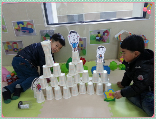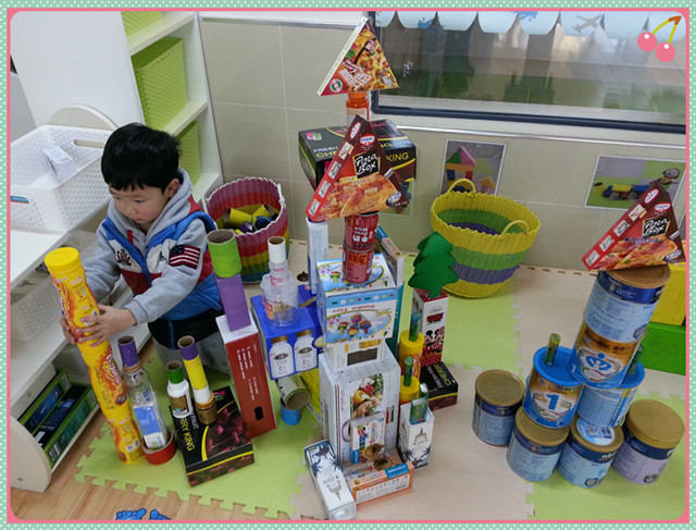 在活动中,各个班级在班内设立了“资源回收列车”,为孩子们积累废旧材料提供了隐性提醒,也让孩子们有了废物再利用的意识。蛋糕盒、牙膏盒、酸奶瓶、旺仔罐、纸杯等收集到一起,为环保建构活动提供了丰富的物质材料。看,孩子们在活动中自由选择、大胆操作和探索呢!用纸杯建构的“快乐酒店”,用奶罐搭起的立交桥,用盒子架起来的高楼大厦,都是孩子们的最美创意。