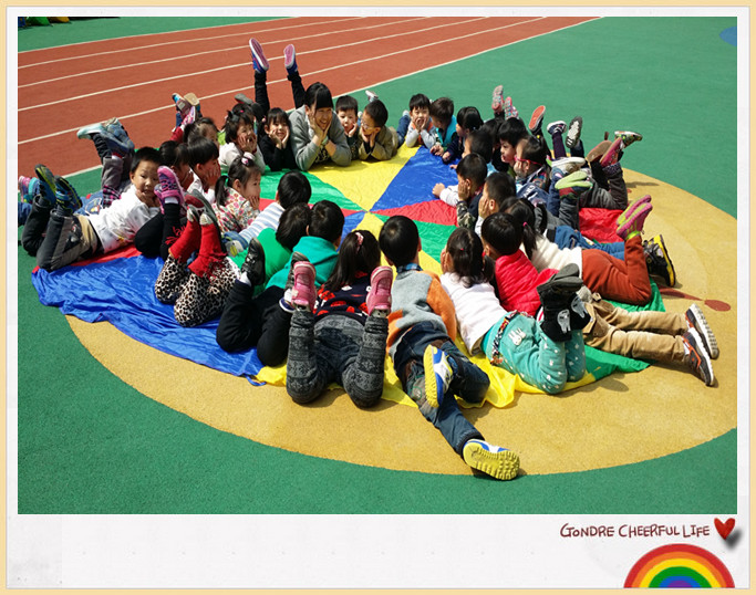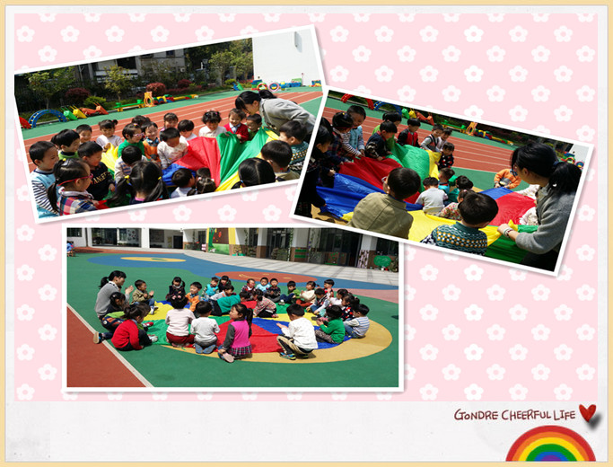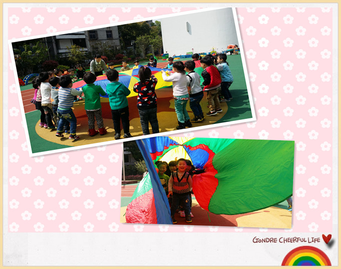 《纲要》中明确指出:“开展丰富多彩的户外游戏和体育活动,培养幼儿参加体育活动的兴趣和习惯,能增强体质,提高对环境的适应能力”,以及“保证幼儿每天有适当的自主选择和自由活动时间”。瞧,老师们为小班的孩子们准备了丰富的活动材料,孩子们每天都可以选择自己喜欢的材料进行户外活动。今天颜色鲜艳的彩虹伞吸引住了孩子们的目光。孩子们在老师的帮助下,大胆尝试创新了许多玩法,有坐在上面边演边唱的“彩虹音乐会”,有轻舞飞扬的“彩虹洗衣机”,有老师和孩子们快乐的拥抱在一起的“彩虹大太阳”等等。暖暖的太阳下,满满的都是孩子们和老师们的欢声笑语,快乐的音符如精灵般飞扬。