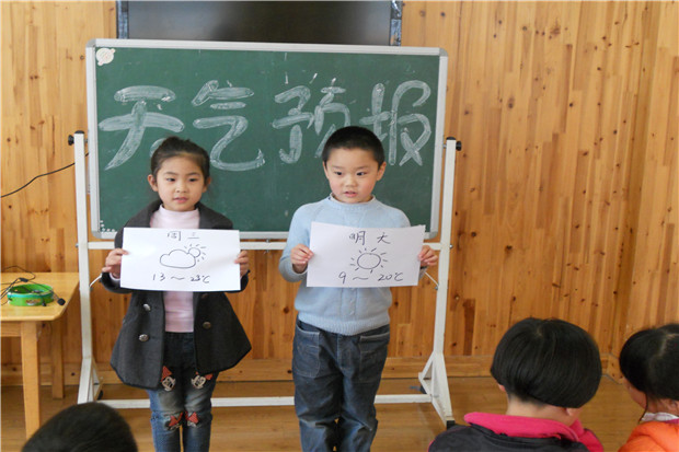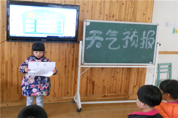 气象播报活动不仅使孩子了解了常用的气象知识,还能准确地运用气象术语复述天气预报,提高了自己在集体中大胆表达的能力,更重要的是孩子们在老师的引导下,学会根据气候做好上学和外出的准备了,雨天懂得带雨具,降温懂得加衣服。观看天气预报、了解气象常识帮助他们提高了生活质量,而且还使孩子们养成关注自然、关心气象的习惯。