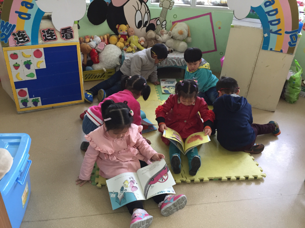 首先,教师为了培养孩子对图书的兴趣,带领幼儿先去参观了园内的幼儿阅览室,在阅览室里,各色各样的图书玲琅满目:童话故事、幼儿故事、英语图书、绘本故事……孩子们的小眼睛东瞧瞧西看看,拿起每一本书似乎都爱不释手的不愿意放下,被书本上鲜亮的颜色和好看的画面所深深吸引。孩子们坐在小椅子上安静地翻看着自己喜欢的图书,最后要离开的时候,许多小朋友依然恋恋不舍,不时的回头张望图书,好像已经和图书成为了好朋友。