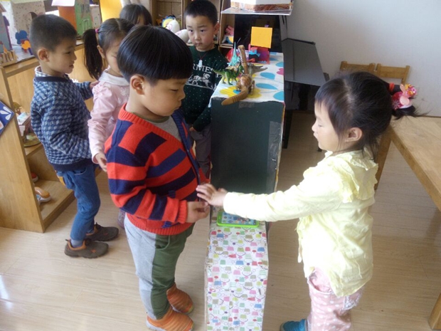 在角色游戏中,我们选定了孩子们游戏生活中常常接触到的售票员、摄影师、化妆师、服务员、司机、快递员等作为体验职业,让孩子在真实的游戏情境中感受劳动者的辛劳。听,淘宝店主正在高声叫嚷着自己店的精品,售货员正在热情地招呼着小顾客,不时传来讨价还价的声音;看,摄影师为了拍出靓丽的照片绞尽脑汁,指导着顾客摆着各种造型;瞧,忙碌的快递员正在打包快递,正要出发……
