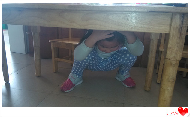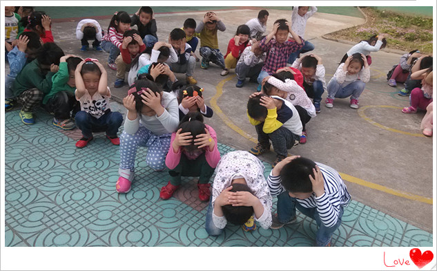 各班老师利用晨间谈话时间,用PPT向孩子们生动形象地进行有关地震自救方法的教学,使孩子们知道地震来时不能慌张,要找安全的地方躲避,不能乱跑乱动。下午,随着一声铃声长响,孩子们迅速放下手中玩具、图书,用双手抱住头部,有的钻到桌子底下,有的躲在角落或墙角边狭窄的地方。铃声再次响起,孩子们在老师的指挥下迅速到楼梯口集合,以手掩头洞着楼梯墙边情事向操场撤离,在空旷的操场中间抱头蹲下。随后,老师进行了人数清点。演练中,老师恪尽职守,镇定自若,孩子们临危不惧,整个过程紧张激烈,有条不紊,取得了成功。