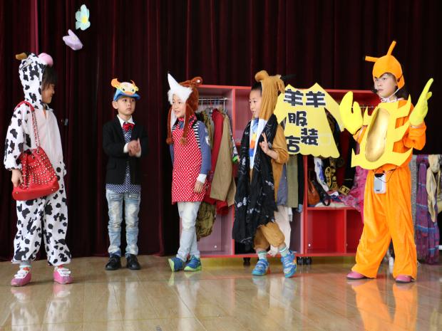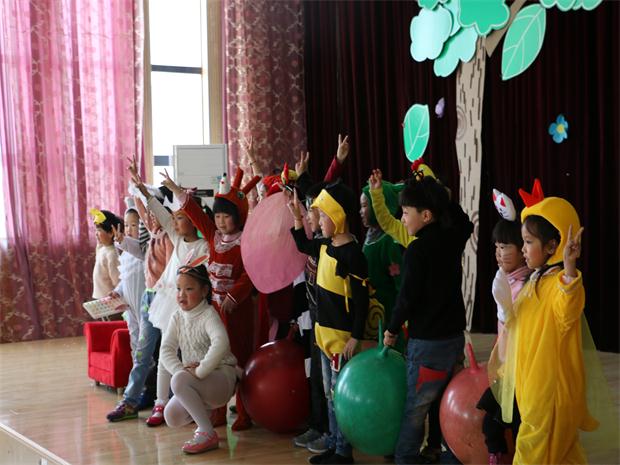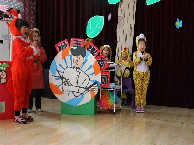 在主题背景的指引下,每班幼儿都分成了两组,对同一个故事进行了不同理形式的演绎。 在大三班表演的“小螃蟹找工作”游戏中,当小螃蟹在找工作的过程中,虽然遭遇到了种种困难,但是她并没有泄气,最后在不懈的坚持下,终于找到了适合自己的工作。在故事表演中,幼儿通过对不同职业的演绎,对各种职业都有了深刻的解读和理解,也深知爸爸妈妈上班赚钱的辛苦,最后幼儿在动感的音乐中结束了精彩的本色表演。