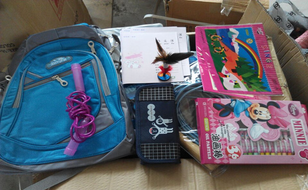 参加此次公益活动的老师们细心地在每个笔袋中装入铅笔,橡皮,卷笔刀等文具,然后将笔袋,蜡笔,本子,美工纸等放进书包。老师们考虑周全,还为每个孩子准备了绳子和毽子,让他们在课余进行体育锻炼。