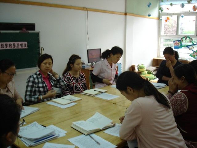 小金星兆丰幼儿园,组织全体教师围绕“餐前餐后管理”,进行了深入的学习和研讨。首先保健老师对:餐前的各种准备工作、进餐过程中的看护、餐后的管理和组织等提出了进一步的要求。同时还对餐前消毒如:消毒水的配比,桌面擦洗的流程,正确的盥洗顺序等等做了详细的指导。