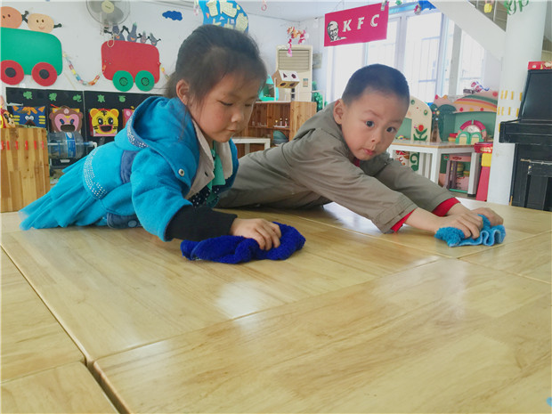一大早,孩子们就兴致勃勃地拿着从家中带来的小抹布走进了幼儿园,他们说:“今天我们要劳动。”整个幼儿园弥漫着劳动最光荣的氛围,到处看见孩子们忙碌劳动的身影,孩子们模仿着平时爷爷奶奶在家里做家务,还有保育员老师为我们劳动的情景,把沾满灰尘的抹布在清水里洗一洗、搓一搓,搓干净了之后继续卖力地劳动。孩子们在自己的教室里擦着桌子、椅子和玩具橱,细心照顾自然角里的动植物,忙的不亦乐乎。