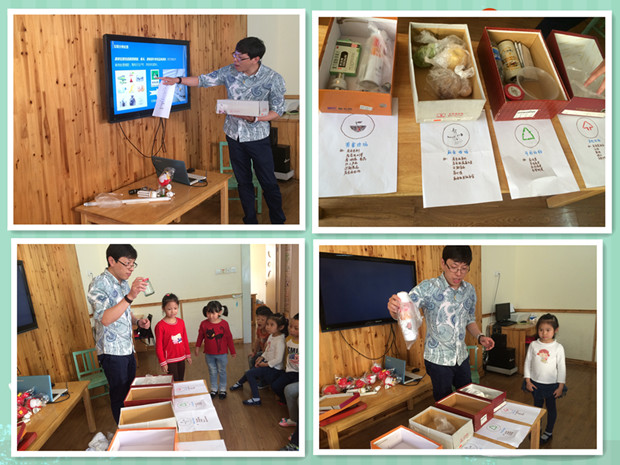 活动中,韩爸爸通过幻灯片讲述远古至今“灯”的发展史,让幼儿了解如何才能节约用电;再延伸垃圾如何分类。并结合上周夜间突下冰雹的天气及“五一”各景点的垃圾满地的现象;通过视频给孩子们讲解了日常生活中的垃圾给环境、人类健康带来的巨大危害,激发了孩子们想要保护环境的极大的热情与责任感,大家纷纷争做环保小卫士。并在最后设置“有奖竞猜”活动,让幼儿进一步了解节能环保知识,让整个活动气氛燃到最高点。每个活动都体现着爸爸的爱与努力,孩子们更是情绪愉悦,积极投入活动中。