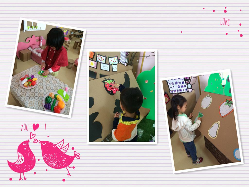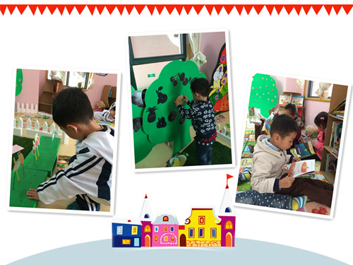 我们围绕主题“蔬果乐”,开设了益智区、阅读区、美工区、数学区、生活区。“游戏时间到了!”在老师的一声令下,孩子们纷纷选择了自己喜欢的游戏区角进行活动。在美工区内孩子们利用毛毛球来给蔬果宝宝穿上好看衣服。数学区中有好多的土地,孩子们根据蔬菜的大小顺序进行种植。益智区的大树上怎么都是黑黑的果子呀?原来那是水果的影子,孩子们正在帮水果宝宝找影子呢。还有的宝宝正在玩蔬果拼图呢,瞧他多认真。动手区的切水果可是很受大家欢迎的,西瓜、南瓜、青菜、茄子……一个一个都切开啦!嘘,还有的孩子在书吧里阅读呢,大家不要打扰他们。
