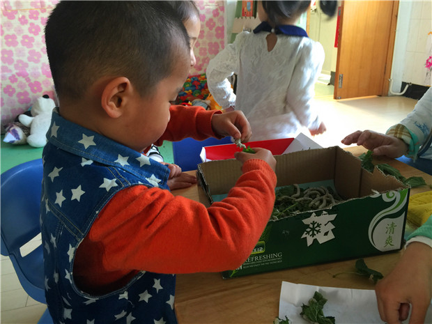 之后的日子里,孩子开始了牵肠挂肚的喂食之旅,孩子们细心得将桑叶剪成碎片轻轻地撒在蚕宝宝们的身上,一切就绪后,孩子们就在一旁静静地观察蚕宝宝进餐。此时孩子们的神情好温柔,像初为人母的妈妈看着自己刚出生的婴儿,眼神中充满了幸福与自豪。随着蚕宝宝一天天地长大,它们的食量也一天天地增加,以前要好几天才能吃完的桑叶现在两天就吃完了。怎么办呢?孩子们纷纷提议请家长们带着自己去采摘桑叶,为蚕宝宝找吃的。接下来的日子里,每天早晨孩子们就迫不及待地把自己采来的桑叶撒在蚕宝宝的“家”里。蚕宝宝们一个个都饿坏了,马上来到桑叶旁狂吃猛咬,不一会儿,桑叶已经是千疮百孔了……望着这些狼吞虎咽的蚕宝宝,孩子们由衷地笑了……