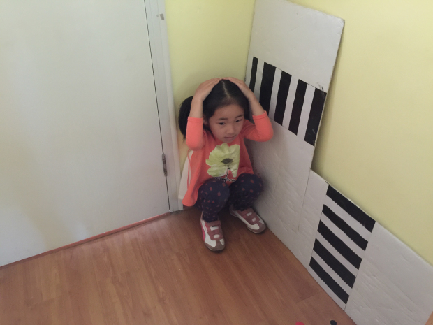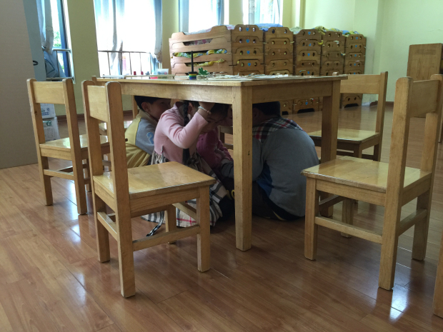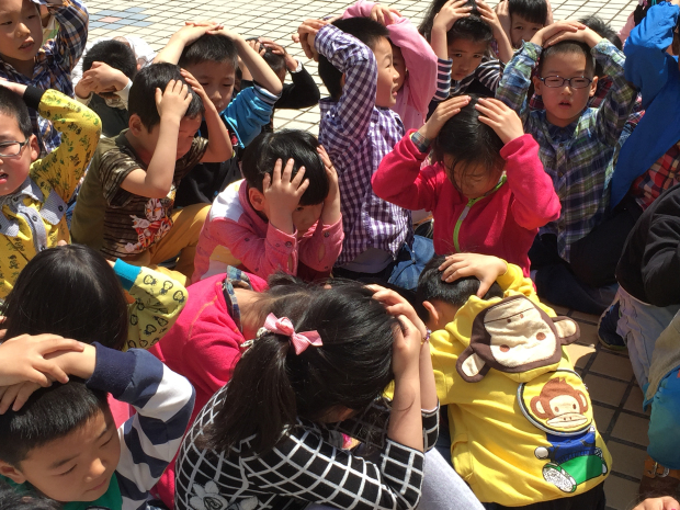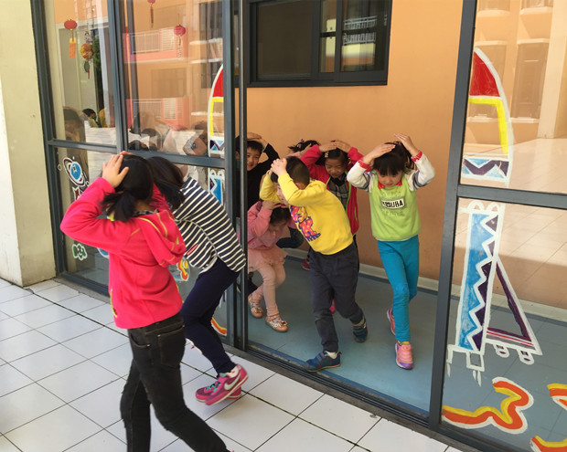 十点钟左右随着广播里“警报”声的响起,幼儿就近在活动场所内进行应急避震。室内的孩子有的躲在了桌子下、有的躲到了厕所墙角、还有的躲在了教室墙角,户外的孩子就空地上蹲下,用双手保护头部。一部分孩子们在老师的带领下,双手抱头,迅速而有序地从安全通道向操场集合,在到达集中地后,小朋友们都自觉地蹲下,双手抱头保护自己的头部,以防被砸,然后由班主任在第一时间清点人数,整个演练过程井然有序,效果好于预期,各班师幼安全意识常态化正悄然形成。
