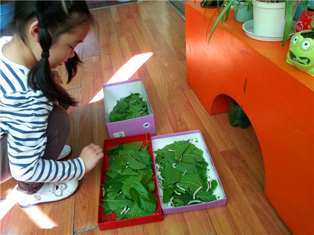 兴趣就是孩子们学习的动力,每周五离园回家的时候,负责的孩子把蚕宝宝带回去管理,周一时再带来,带回去的孩子周一时还要在“晨间谈话”中与同伴共同分享周末蚕宝宝的生长或变化。每当桑叶没有的时候,家长们也会积极的发动周围的朋友圈一起来想办法。在孩子们的精心照顾下,相信我们大班的孩子一定会等到蚕宝宝吐丝的那一天,这一刻一定会给孩子们带来更多的发现和惊喜。