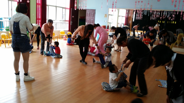 活动中,宝贝们和爸爸妈妈一起大玩布袋游戏,还发现了布袋的多种玩法:可以学袋鼠跳、学毛毛虫扭动、学小蜗牛爬行等等。从大家的张张笑脸,不难看出:通过亲子游戏及亲子情感互动活动,给幼儿与同伴、幼儿与家长、家庭与幼儿园之间搭建沟通的平台,体验合作游戏的快乐。让幼儿在运动中得到锻炼,在竞争中学会合作,在游戏中找到快乐,在关爱中体味亲情。