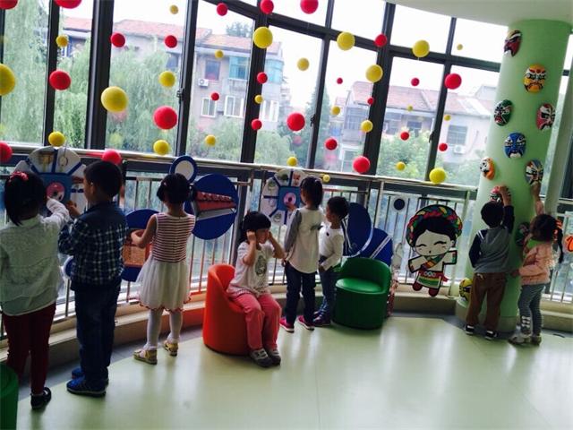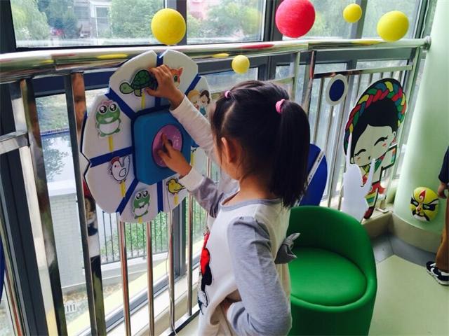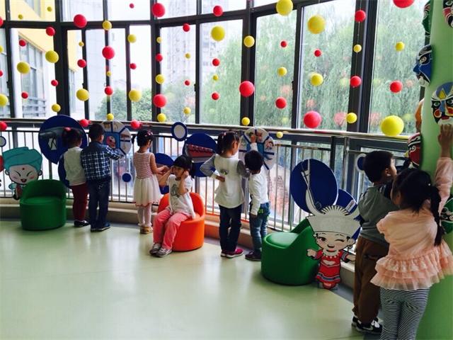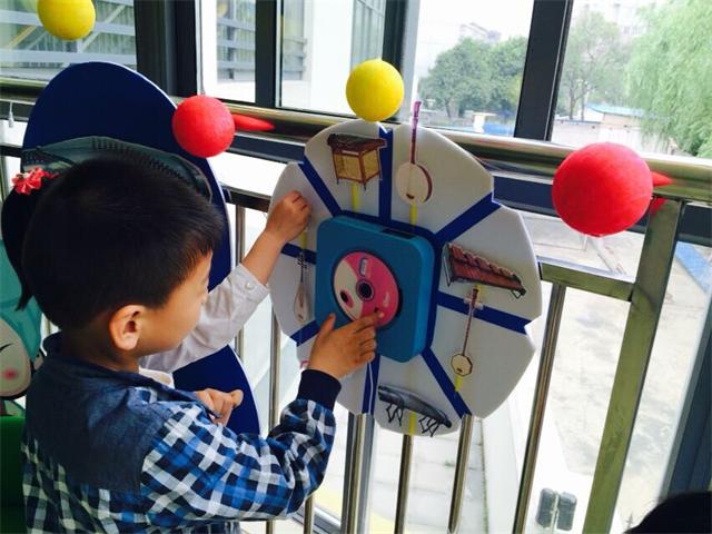 我们决定将主题放在《我的祖国》上,柱子上放置可取放的脸谱;平时可进行京剧表演;走廊上分为儿童歌曲区及民乐区,将各种乐器放置在圆板上,孩子们可以戴上耳机选择自己喜欢的音乐倾听、哼唱,并将听到的内容在板上进行操作,体现了环境的游戏化。