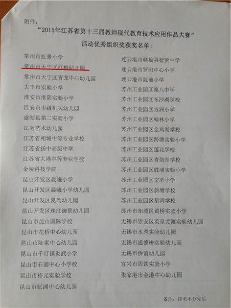 辛勤付出之后,终于喜获累累硕果。近日在“2015年江苏省第十三届教师现代教育技术应用作品大赛”中,我园有21名教师获奖,其中8名教师的作品获得一等奖,幼儿园获得优秀组织奖的光荣称号。