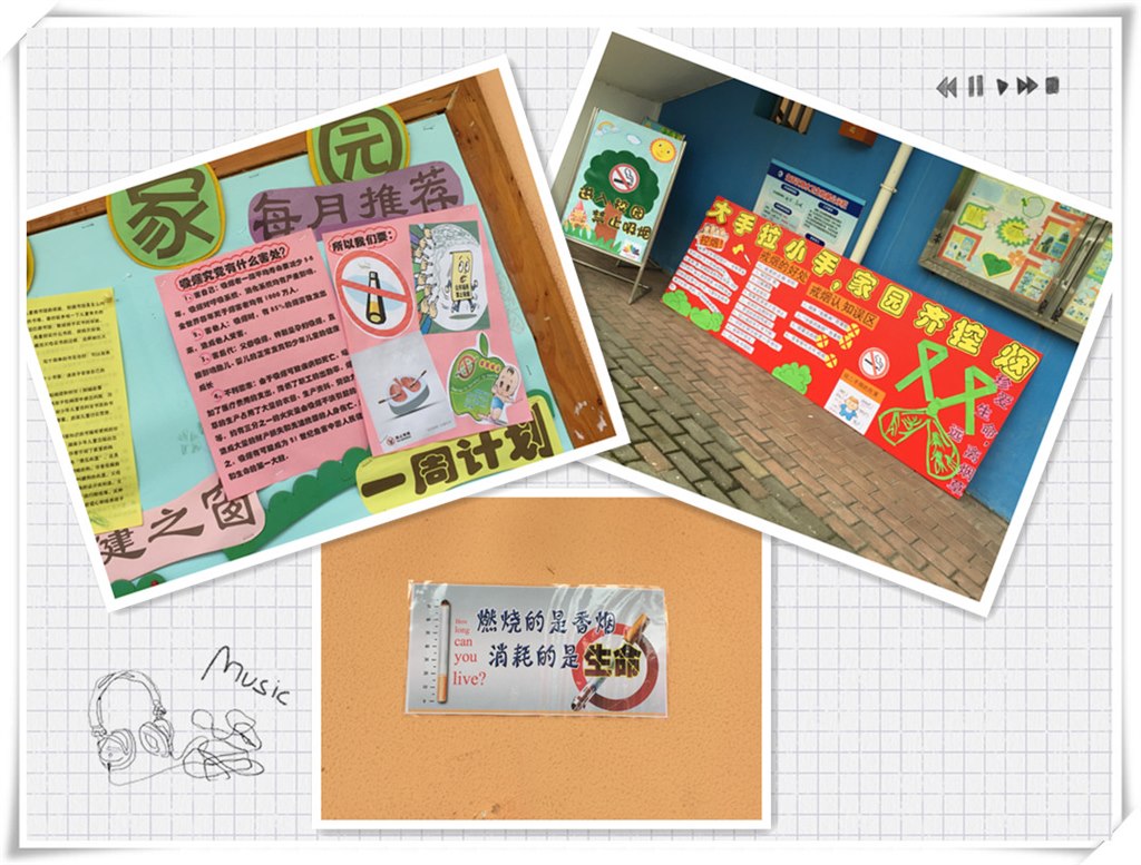 老师们结合图片和动画引导幼儿认识世界无烟日和禁烟的标志,通过家长园地、版面制作等宣传渠道向孩子和家长们宣传吸烟的危害和“世界无烟日”的意义,同时引导幼儿制作禁烟宣传旗子,并利用放学时间向家长们介绍吸烟的危害,让吸烟人群赶快加入禁烟的行列中来,让我们周围的空气越来越新鲜,让每个人都有一个健康的身体。幼儿园还利用在各楼层走廊张贴禁烟标志,时刻提醒每一个进入幼儿园的人都能自觉地遵守禁烟规定。