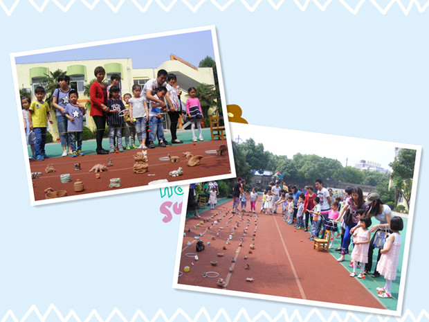 进入幼儿园,风雨走廊里挂着孩子们自己上釉烧制的陶瓷材质的小风铃,系着孩子们感兴趣的谜语;软质操场上摆放着各种陶泥制作的泥偶,为孩子们提供“套泥偶”的户外游戏;各班为孩子们提供了现场做陶的场地、陶泥、工具,让宝贝和爸爸妈妈们参与到亲子陶艺制作中,大班幼儿今天用陶泥制作毕业礼物——笔筒与相框;各个游戏区里有孩子们最爱玩的“玩陶”小游戏:陶珠夹夹乐、泥棋对对碰、圈套泥娃娃、小猫钓陶鱼、花儿朵朵开、一箭中“陶”等游艺项目,深深地吸引了孩子们的眼光,开心地和爸爸妈妈一起玩着各种有趣的“玩陶”游戏,调动了参与玩陶的积极性。爸爸妈妈们仿佛回到了自己的童年,歌声、笑声荡漾在校园的每一片土地。