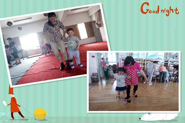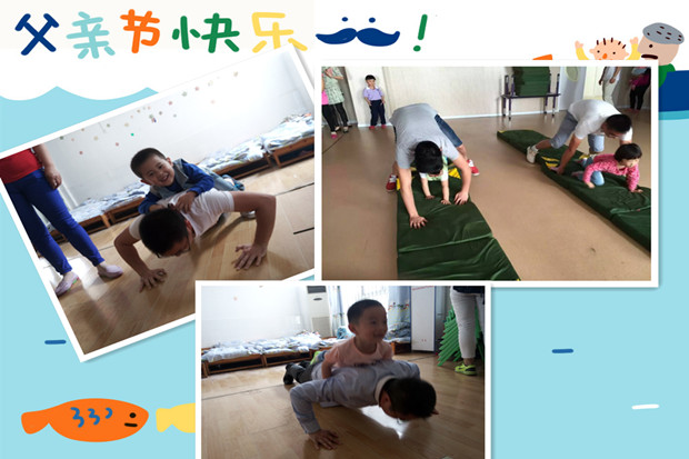 瞧,我们的孩子和家长玩的多高兴。“我的爸爸是大力士”爸爸将孩子背在背上完成5个俯卧撑,我们的爸爸们各个身手不凡,乐的孩子哈哈大笑;“袋鼠跳跳跳”不仅有袋鼠妈妈还有袋鼠爸爸,带着我们的宝贝共同前进;“螃蟹夹球”宝贝和爸爸妈妈一起用棒棒夹住小球向前进;“小脚踩大脚”孩子们踩在爸爸妈妈的脚上共同前进,虽然有些疼但是每个爸爸妈妈都甘之如饴承担着孩子们的重量。