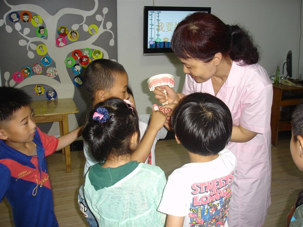 此次活动,保健老师作了精心准备,她利用图文并茂的课件,借助牙齿模型图片,耐心细致地向幼儿讲解牙齿的结构及作用,通过讲述富有童趣的故事,让孩子了解换牙时的正确行为,最后还提供了牙刷现场指导幼儿练习正确刷牙,并巧妙的将刷牙方法编成了朗朗上口的儿歌。在这样轻松快乐的一系列听、说、看、动的互动环节下,孩子们获益多多。