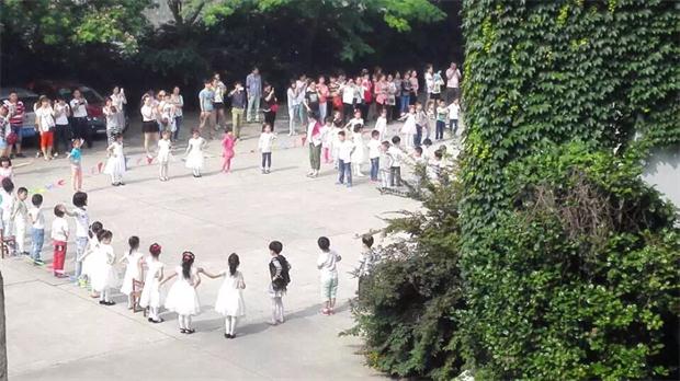 初夏的早晨阳光明媚,在爸爸妈妈期盼的目光中,孩子们踏着整齐的步伐,排着井然有序的队伍走向操场,家长们的脸上洋溢着愉悦的笑容。
