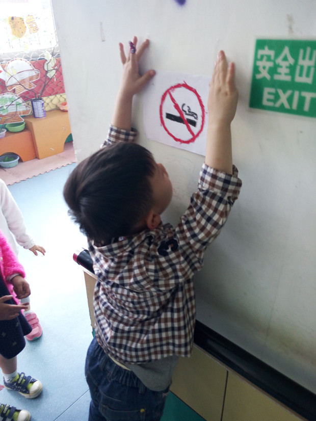 小朋友们通过观看视频教育短片,了解了烟草的危害。在老师的带领下,认识了禁烟标记,并且通过画笔制作了禁烟标记,然后将其张贴在我园醒目的位置,引起关注和重视。为让家长再进一步了解吸烟危害身体健康,通过孩子,鼓励孩子走进家庭、走进社会,劝说家长、邻里,使得一个孩子带动一个家庭,一个家庭带动一个社区,大家携起手来,共同创建一个无烟环境,从而推动城市文明的健康开展。