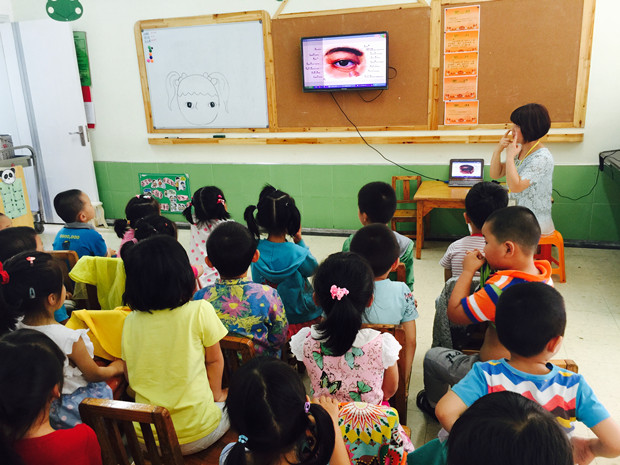 活动的开始,老师带幼儿做“贴五官”游戏和闭眼体验后的感受导入了活动。然后,通过PPT故事,向幼儿宣传用眼卫生知识,教育幼儿掌握正确的看书姿势,生活中不玩危险性玩具,以免不小心碰伤眼睛等。并让幼儿了解了眼睛的构造和用途。活动当中通过一些图片、游戏“什么东西不见了”“蒙眼摸宝贝”及讨论、提问的形式,让孩子们知道了保护眼睛的重要性,掌握保护眼睛的基本知识,知道在日常生活中要养成科学用眼的好习惯。活动的最后,老师还教幼儿共同学习了正确的护眼操,帮助幼儿舒缓疲劳的眼睛。