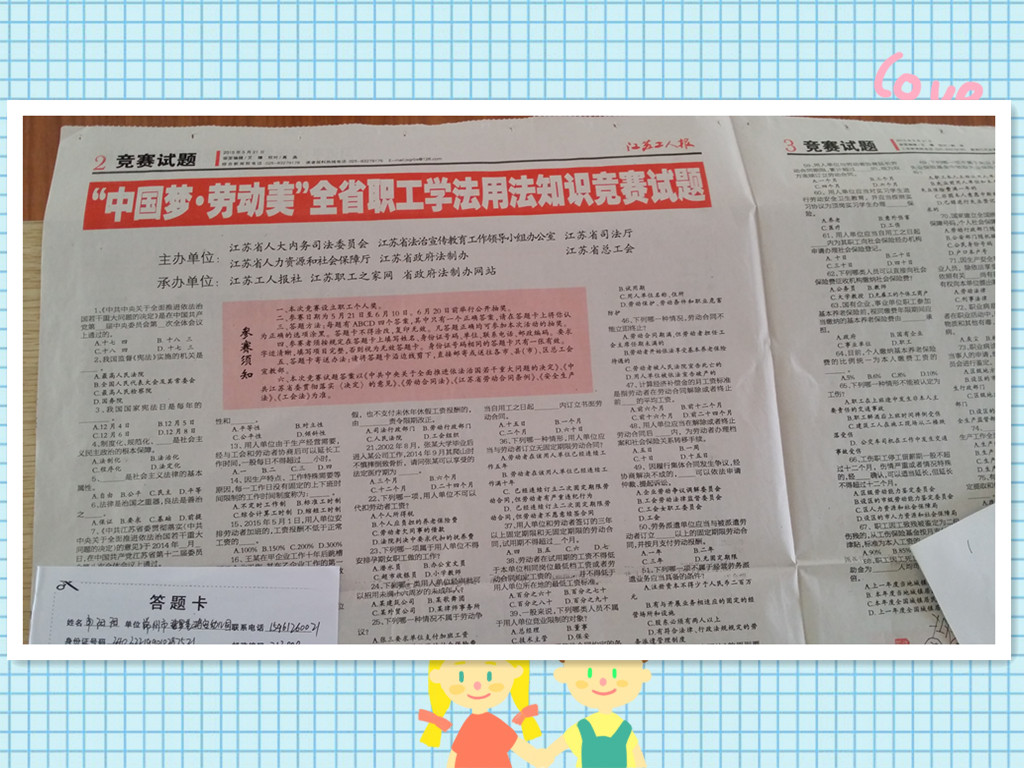 近期,为提高全体教职工的法律意识,单位组织教职工学习“中国梦 劳动美”学法用法知识,并与6月3日中午进行学法用法知识竞赛。