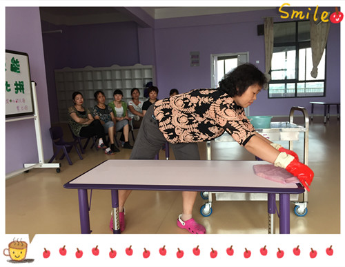 本次比赛的内容包含幼儿保健常识竟答以及叠被子、桌面消毒实践操作。比赛中,保育员阿姨们都很好地回答了幼儿保健知识问题,信心十足地迎接实践操作的挑战。“开始!”评委一声令下,叠被子比赛开始,保育员阿姨先迅速的将被子铺展开来,然后进行折叠,尽可能地加快速度。被子在保育员阿姨手里一折一叠,不到几分钟,被子已经整齐地放那儿。桌面消毒比赛进行得也是如火如荼,擦桌子虽然看似简单,但是要注意擦的顺序、速度、方式。这么多注意事项,阿姨们在比速度的同时,还要做到位,确实不容易。保育员阿姨对叠被子和擦桌子的操作动作娴熟、程序规范,表现出良好的业务素养。