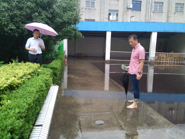 全市昨晚普降暴雨,到处出现淹水现象。6月17日一大早,区教育文体局计财科副科长戚志宏、茶山街道办事处副主任叶春静、茶山街道水利站站长朱春芳先后冒雨来到茶山中心幼儿园淹水险点,视察汛情,安排相关防汛工作。